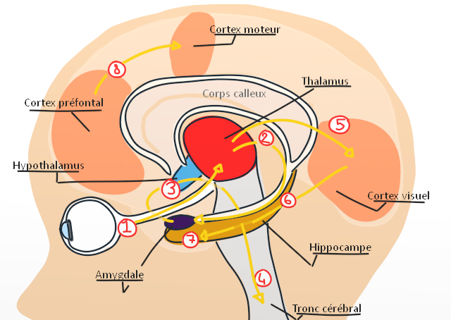 Ce sont tout d’abord les yeux qui transmettent l’ensemble des informations qu’ils captent au thalamus : une gare de triage. Le thalamus envoie à l'amygdale l'information qu'il vient de recevoir (ex: une énorme masse sombre vient d'apparaitre) : peu précis mais extrêmement rapide.